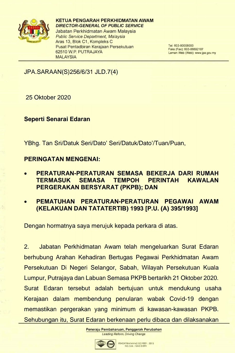 Jabatan Perkhidmatan Awam On Twitter Surat Edaran Jpa Saraan S 256 6 31 Jld 7 4 25 Okt 2020 Peringatan Mengenai Peraturan Peraturan Semasa Bdr Termasuk Semasa Tempoh Pkpb Dan Pematuhan Peraturan Peraturan Pegawai Awam Kelakuan Dan